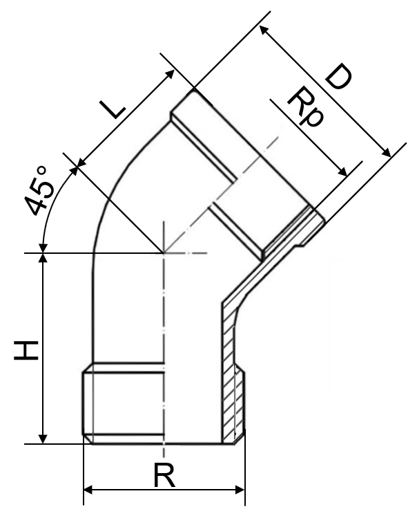 - Verbindet ein Außengewinde mit einem Innengewinde im 45°-Winkel